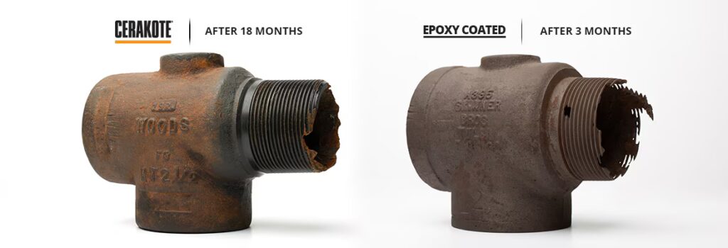 Tight tolerance parts such as threads and valves are generally left uncoated due to the tolerance limitations of thick paints, powder coatings and plasma spray. This leaves the most critical areas of your operation exposed and unprotect. Not only does Cerakote have the industries leading corrosion protections, it is applied the entire part (external and internal without the need for expensive masking), including the most difficult threads, valves, and impellers…