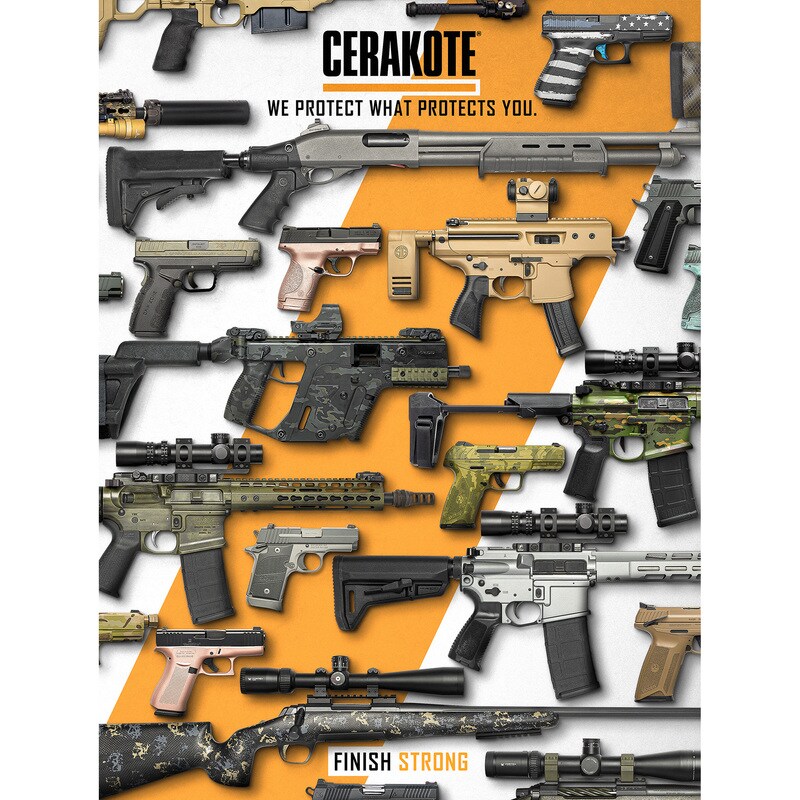 The Official Cerakote Firearms poster is printed on high quality, 15oz. anti curl blockout banner material. It features a smooth and vibrant finish for high-end viewing.
