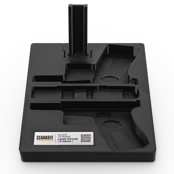We designed this fixture to fit disassembled Glock® 19 frames (Gen 3-5). This laser fixture holds the frame in 5 different positions, allowing you to laser both sides, bottom, front, and backstrap. This is a production-friendly solution for customizing your Glock with a stipple pattern, engraving, or Cerakote Laser Imaging.