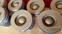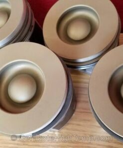 Cerakote V Series Piston Coat is a dark bronze/gold with a soft metallic look. It is an oven cure ceramic thin film thermal barrier coating designed to be applied on the top of pistons, on the top of valves, and the combustion chamber on a cylinder head.
