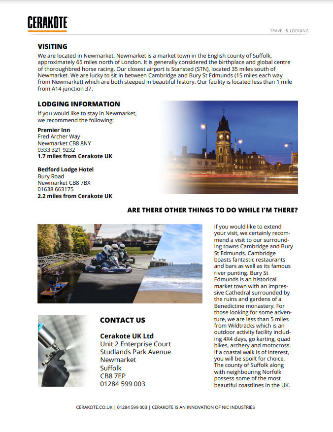 Please review each document for more information on becoming a Certified Cerakote® Applicator, travel information and our general training outline. It is best to start the process by filling out our application (*Cerakote Training Request Application Form). Answering these questions will help us get a better understanding of who you are and what you are wanting to accomplish. Once the application is received, we will verify the market area you are in, is not saturated as we review your application (if applicable). You will be sent an invoice for £500 + vat (per person) to reserve your spot in our next available training class.